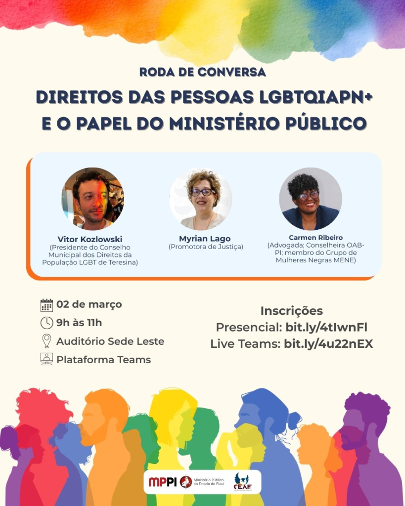 O Ministério Público do Estado do Piauí (MPPI) realizará, no dia 02 de março, a Roda de Conversa “Direitos das Pessoas LGBTQIAPN+ e o papel do Ministério Público”. O evento acontecerá em modo híbrido, a partir das 9h, presencialmente no Auditório da Sede Leste, e também com transmissão via Plataforma Teams.