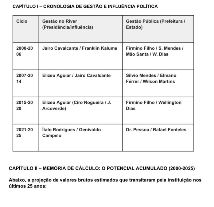 O torcedor Diaslano Sampaio protocolou junto à Ouvidoria do Ministério Público do Piauí um dossiê detalhando possíveis irregularidades na gestão do River Atlético Clube entre 2000 e 2025. Segundo a denúncia, o clube acumula um passivo de R$ 14,1 milhões, mesmo com faturamento estimado em mais de R$ 82 milhões durante o período, além de 307 processos ativos, incluindo dívidas trabalhistas, ações cíveis e tributos em atraso.