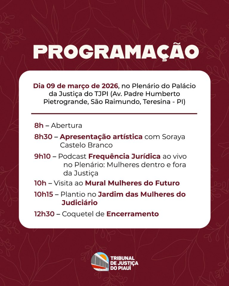 A agenda inclui apresentação artística da cantora Soraya Castelo Branco, plantio de mudas no Jardim das Mulheres do TJPI, transmissão ao vivo do Podcast Frequência Jurídica diretamente do Plenário e visita ao Mural Mulheres do Futuro.