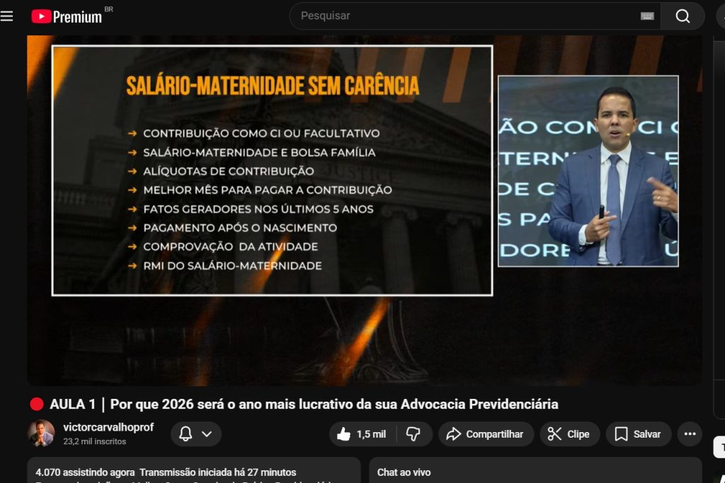 O primeiro dia do curso online “O Grande Ano da Sua Advocacia Previdenciária” registrou forte repercussão e alto engajamento, com mais de 4 mil pessoas acompanhando simultaneamente a transmissão ao vivo pelo YouTube. O evento é conduzido pelo advogado e especialista em Direito Previdenciário, Dr. Victor Carvalho, e segue com programação gratuita ao longo de três dias.